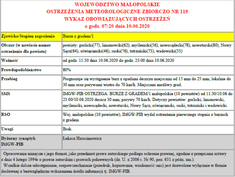 Ostrzeżenie meteorologiczne burze z gradem/1 2020-06-10