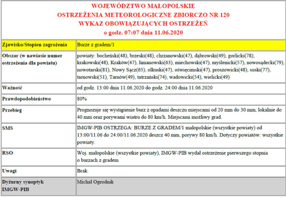 Ostrzeżenie meteorologiczne burze z gradem/1 2020-06-11