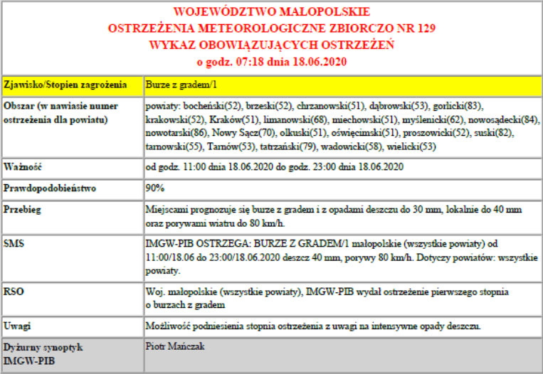 Ostrzeżenie meteorologiczne burze z gradem/1 2020-06-18