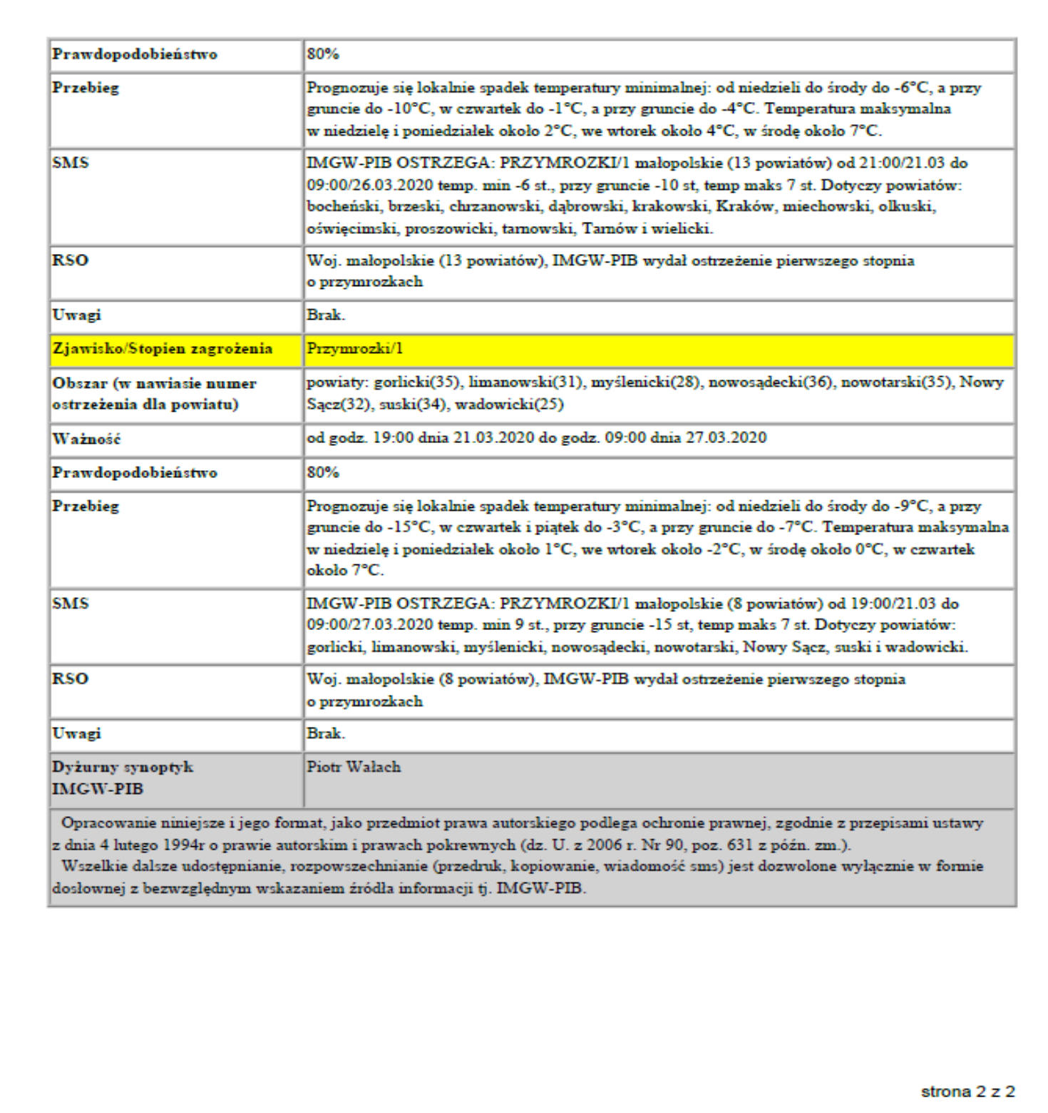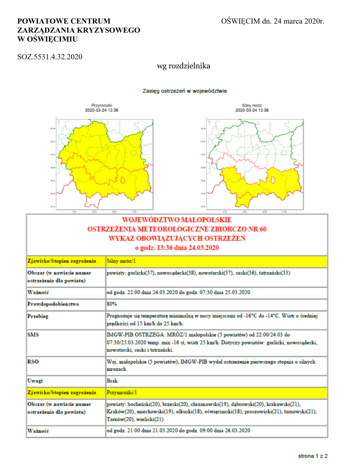 Ostrzeżenie meteorologiczne - mróz 2020-03-24