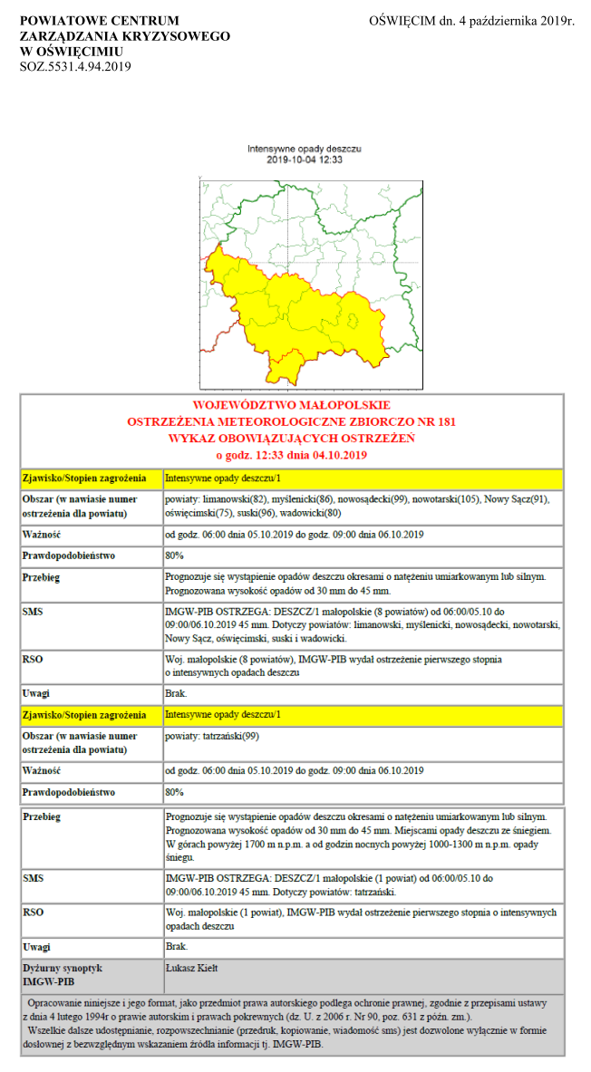 Ostrzeżenie meteorologiczne nr 181-Intensywne opady deszczu/1 2019-10-04