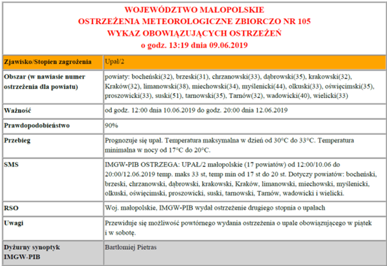 Ostrzeżenie meteorologiczne nr 44 o upałach 2 stopnia 2019-06-10