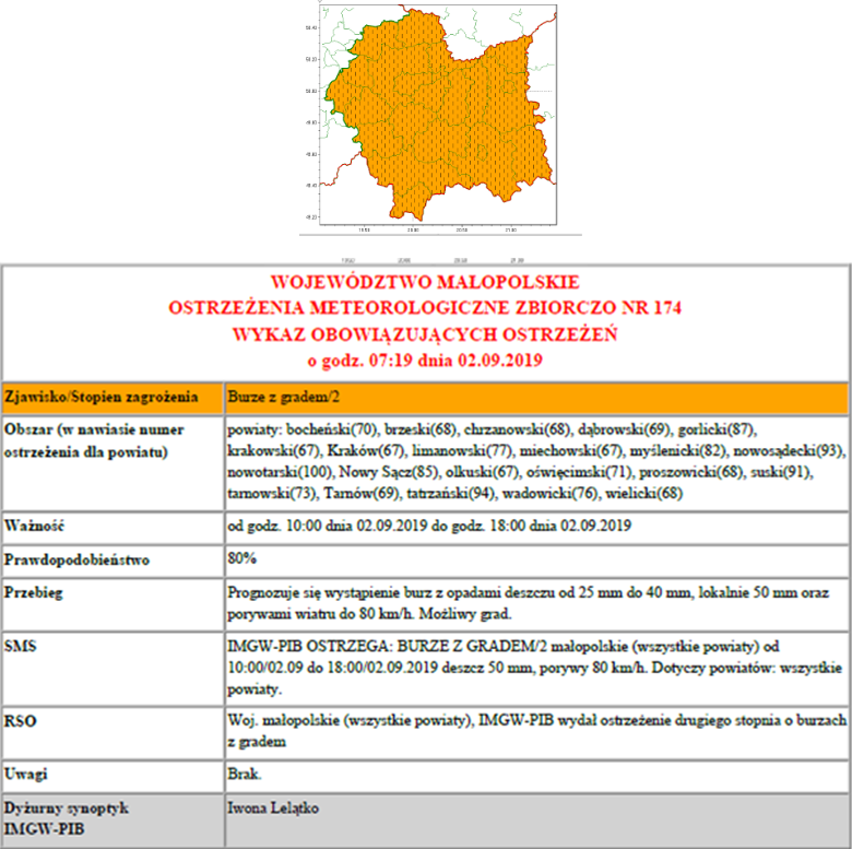 Ostrzeżenie meteorologiczne o burzach z gradem 2 stopnia 2019-09-02