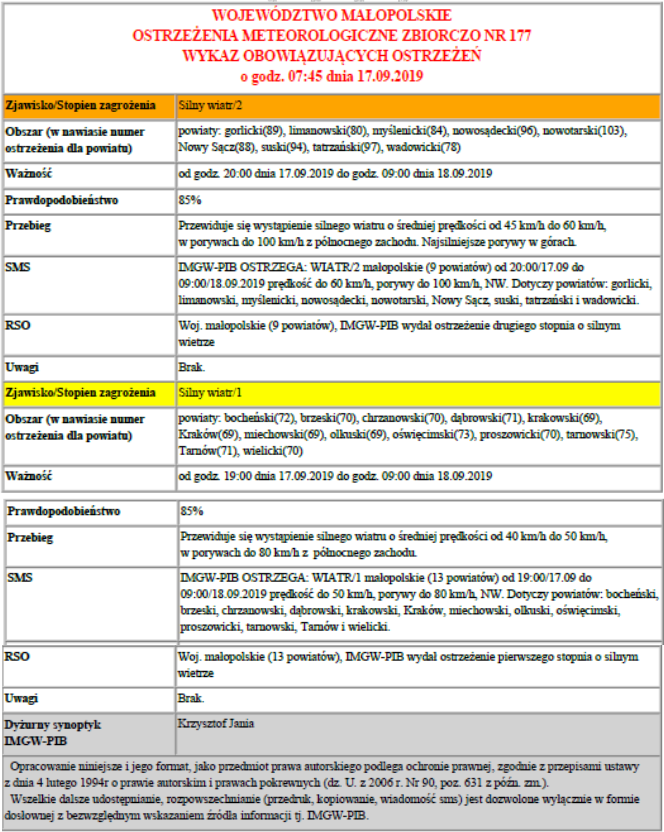 Ostrzeżenie meteorologiczne o silnym wietrze 1 stopnia 2019-09-17