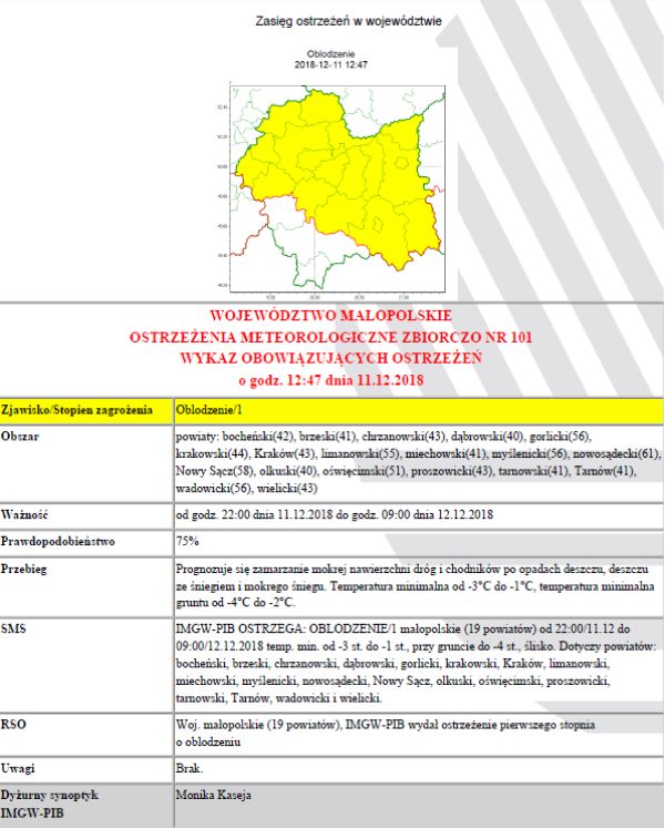 Ostrzeżenie meteorologiczne oblodzenie 1 st. 2018-12-11