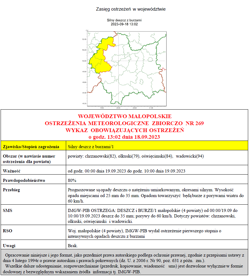 O wszelkich zdarzeniach mających istotne znaczenie dla bezpieczeństwa ludzi i podjętych działaniach oraz ewentualnych szkodach, proszę informować Powiatowe Centrum Zarządzania Kryzysowego w Oświęcimiu nr tel. 33/ 844 89 80, lub Stanowisko Kierowania Państwowej Straży Pożarnej w Oświęcimiu tel. 112, 998 lub Komendę Powiatową Policji w Oświęcimiu tel. 47 832 62 80.