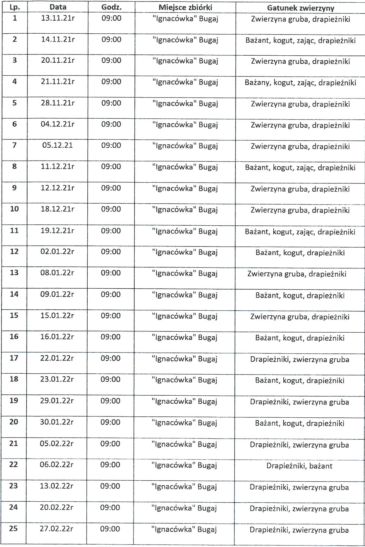 Stosownie do art. 42ab ust. 2 ustawy z dnia 13 października 1995 r. prawo łowieckie (t.j. Dz. U. z 2020 r., poz. 1683) podaje do publicznej wiadomości plany polowań zbiorowych w sezonie łowieckim 2021/2022 dla Koła Łowieckiego „KRUK” w Zatorze oraz Koła Łowieckiego „Diana” w Chrzanowie.