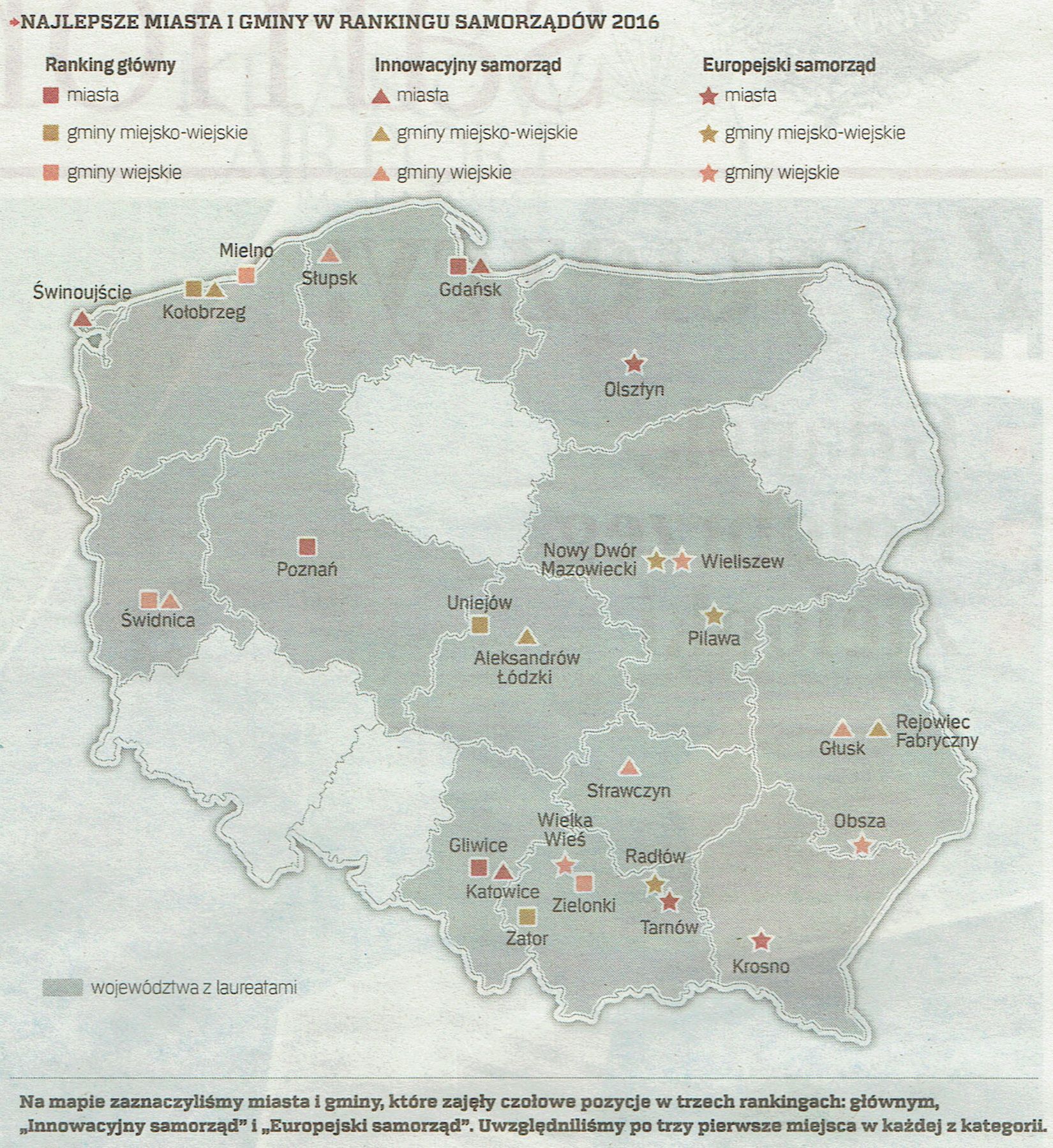 Wszystkie te gminy mogą pochwalić się dobrymi wynikami w części rankingu dotyczącej jakości zarządzania. Zator ma znakomite efekty w dziedzinie edukacji, zarządzania administracją oraz wsparcia przedsiębiorczości. Świdnica skutecznie wspiera rozwój społeczeństwa obywatelskiego i lokalnej gospodarki. Natomiast Mielno dostało najwięcej punktów w zakresie dialogu społecznego oraz edukacji. Gmina Zielonki zajęła pierwsze miejsce wśród gmin wiejskich już po raz drugi. Ale na gratulacje zasłużyły też: gmina Zębowice (woj. opolskie), która awansowała o 27 oczek (na 10. pozycję), oraz gmina Biłgoraj (woj. lubelskie) - awans o 22 miejsca (na 13.). W tegorocznym Rankingu Samorządów wśród 252 najlepszych gmin i miast w Polsce najwięcej jest samorządów z województw: mazowieckiego (33), śląskiego (31) i małopol-skiego (27). Są to największe województwa w kraju i prawdopodobnie dlatego w zestawieniu jest tak liczna ich reprezentacja. Najmniej gmin pochodzi z województw: opolskiego (4), warmińsko-mazurskiego (8) oraz łódzkiego (9).
