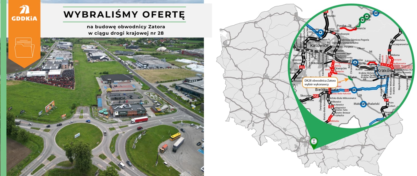 Firma Skanska została wybrana jako wykonawca budowy obwodnicy Zatora, odcinka drogi krajowej nr 28, który o długości 2,1 km wyprowadzi ciężki ruch z centrum miasta. Całkowity koszt inwestycji wynosi 78,6 mln zł. Wybór wykonawcy odbył się w trybie dialogu konkurencyjnego, co jest nietypową procedurą stosowaną ze względu na innowacyjny charakter projektu, który wykorzystuje nowoczesną metodykę BIM (Building Information Modeling).