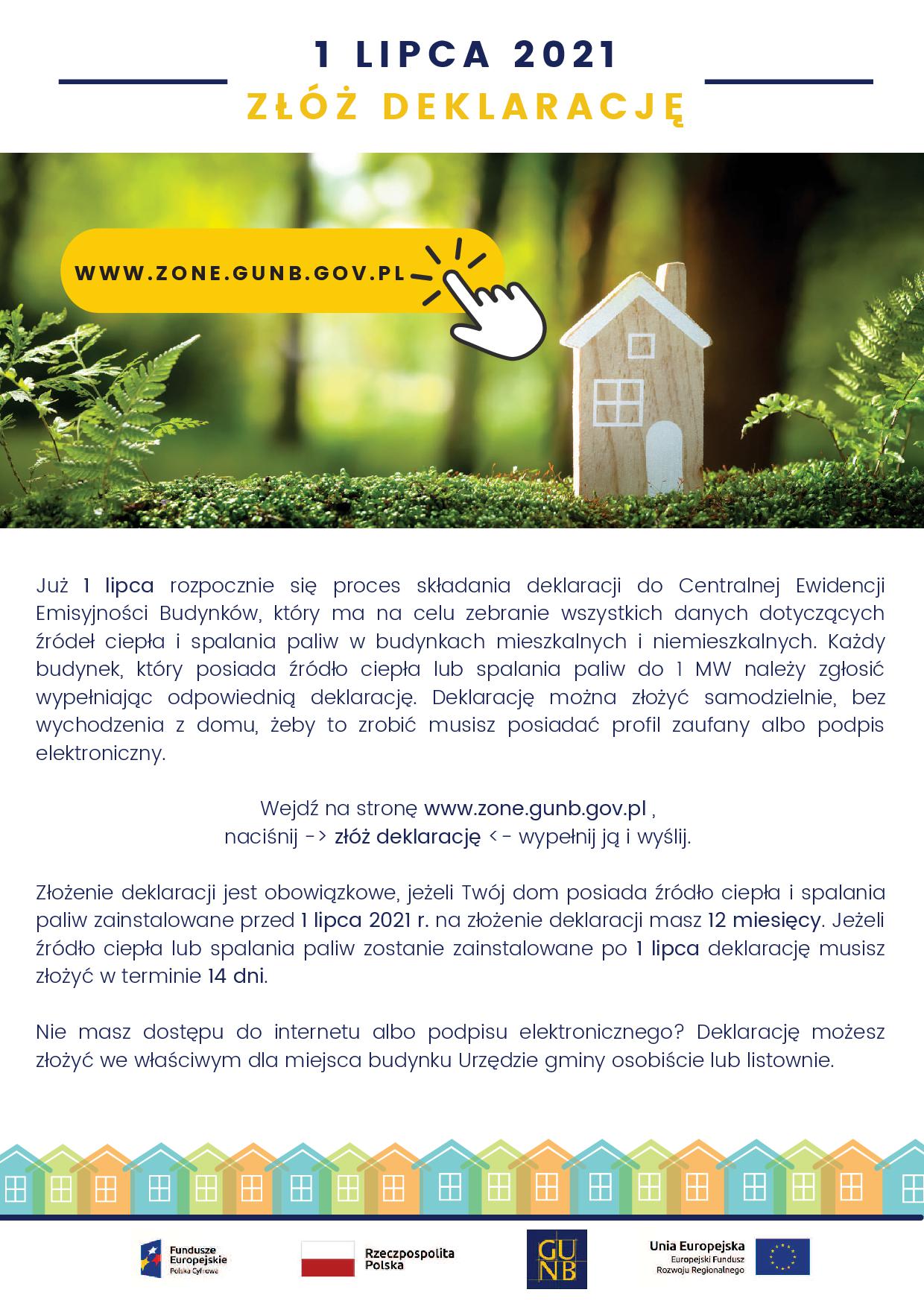 Deklarację można złożyć w prosty sposób przez Internet – www.zone.gunb.gov.pl – nie wychodząc z domu. Wystarczy, że posiada się Profil zaufany/bankowość elektroniczną/e-dowód. Jeżeli nie masz dostępu do Internetu deklarację możesz złożyć osobiście w urzędzie właściwym dla lokalizacji zgłaszanej nieruchomości albo wysłać do urzędu listem poleconym.