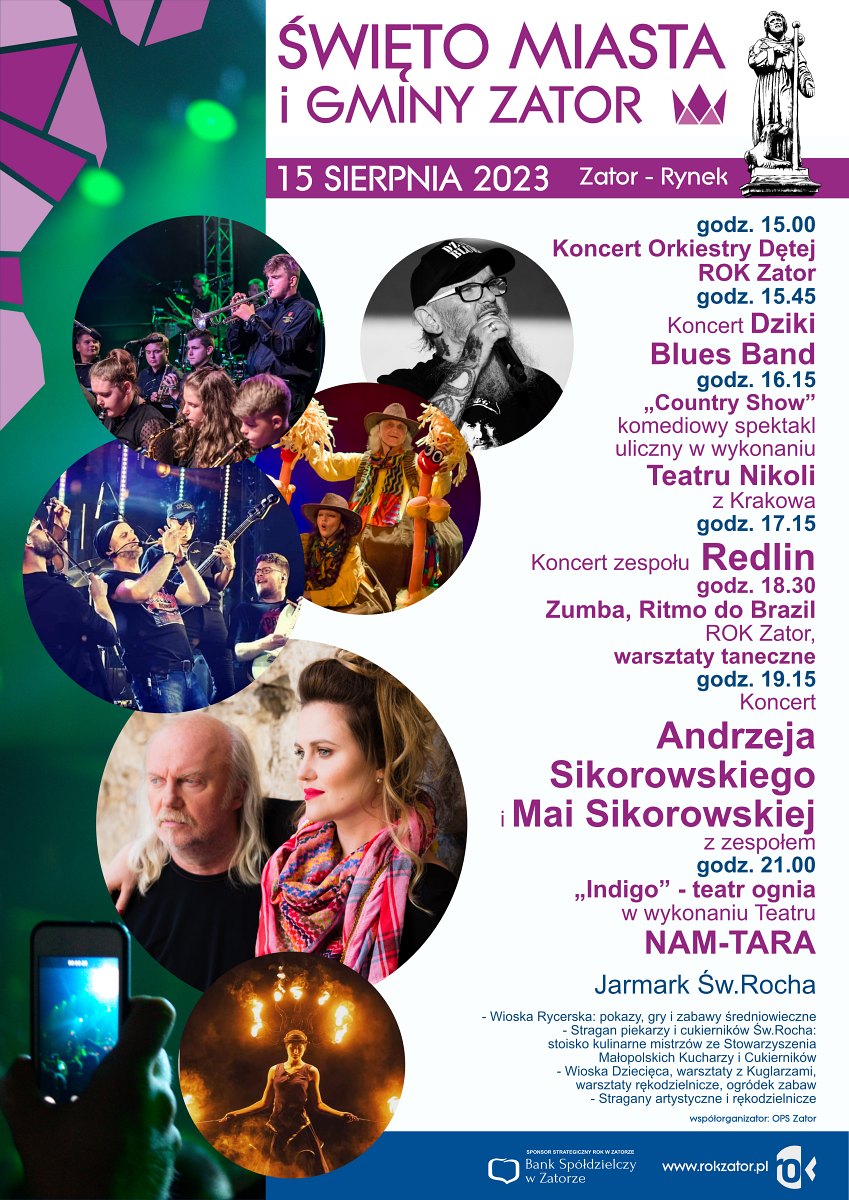 Od 15:00 do nocy na zatorskim Rynku obchodzić będziemy Święto Miasta i Gminy Zator 2023! Zapraszamy na koncert naszej Orkiestry, Dziki Blues Band, Redlin. Będą warsztaty taneczne, spektakl plenerowy, a na koniec koncert Andrzeja i Mai Sikorowskich oraz Tear Ognia Nam Tara.
