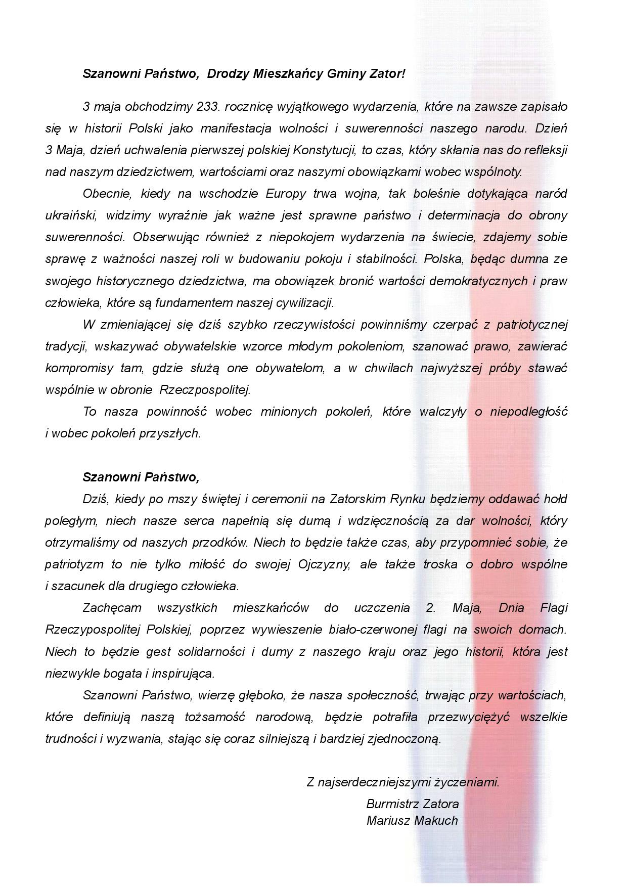 Szanowni Państwo, Drodzy Mieszkańcy Gminy Zator! 2024-04-30