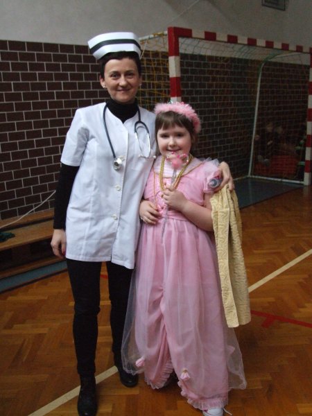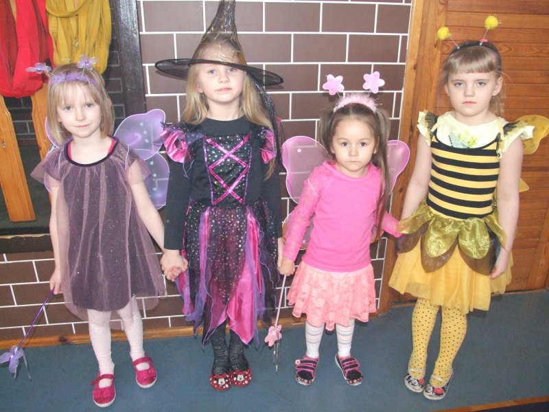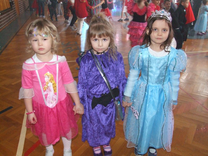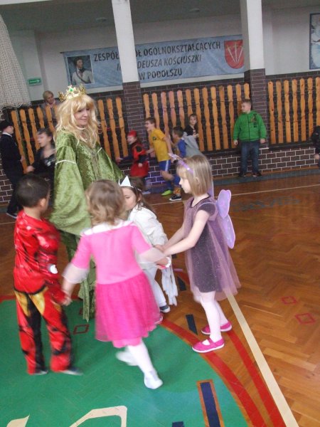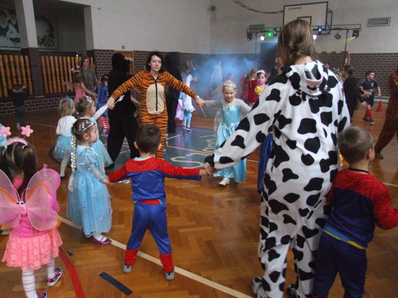 O świetną zabawę zadbali uczniowie ze szkolnego radiowęzła oraz DJ Czaro- absolwent szkoły. Dla tej grupy wiekowej przygotowali największe dziecięce hity, przy których bawiły się dzieci przebrane w różnorakie kostiumy. Przy pomocy masek, peruk, makijaży i kolorowych ubrań przeobraziły się w najróżniejsze postacie. Wśród dziewczynek najwięcej było księżniczek, chociaż nie zabrakło i czarownic. Chłopcy wybrali stroje ulubionych piłkarzy, strażaków, bajkowych i filmowych bohaterów. Dzieci, ubrane w przepiękne stroje, dały porwać się zabawie, którą prowadził wodzirej, przebrany w kostium gigantycznego kurczaka. Nie zapomniały też o przebraniu się panie wychowawczynie, które zachęcały dzieci do wspólnych zabaw. Były korowody, kółeczka, tańce w parach i z pokazywaniem różnych choreografii. Radości przy tym było, co nie miara.