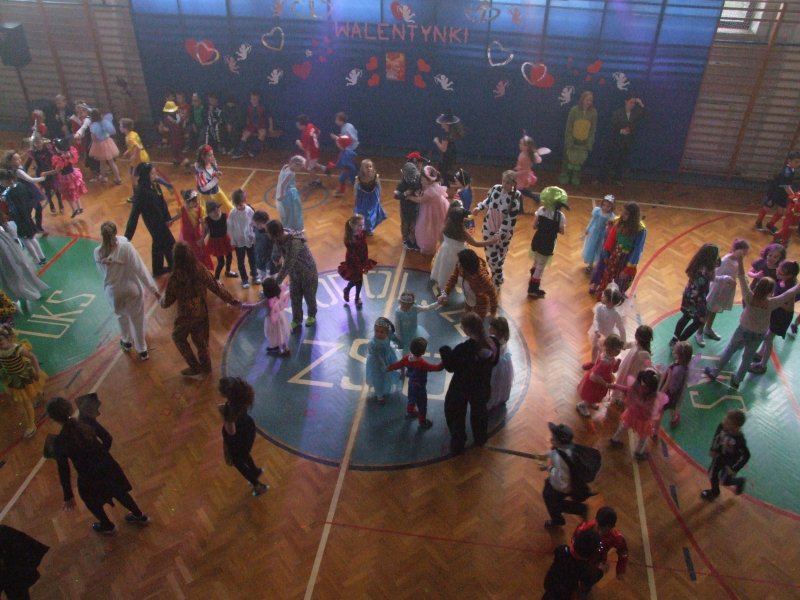 14 lutego w godzinach dopołudniowych bawiły się przedszkolaki, „zerówkowicze” oraz uczniowie młodszych klas szkoły podstawowej. Dzieci bawiły się w pięknie przystrojonej sali gimnastycznej, która tego dnia zamieniła się w salę dyskotekową. Niesamowity efekt tworzyły kolorowe, dyskotekowe światła i animacje.