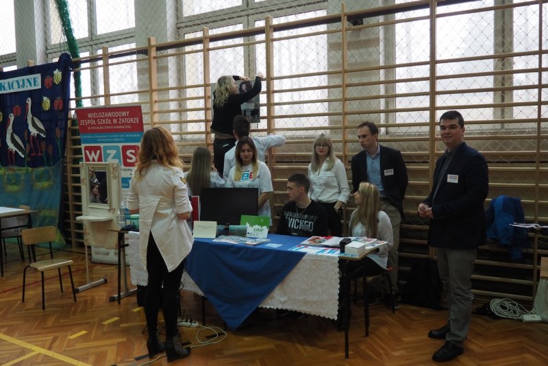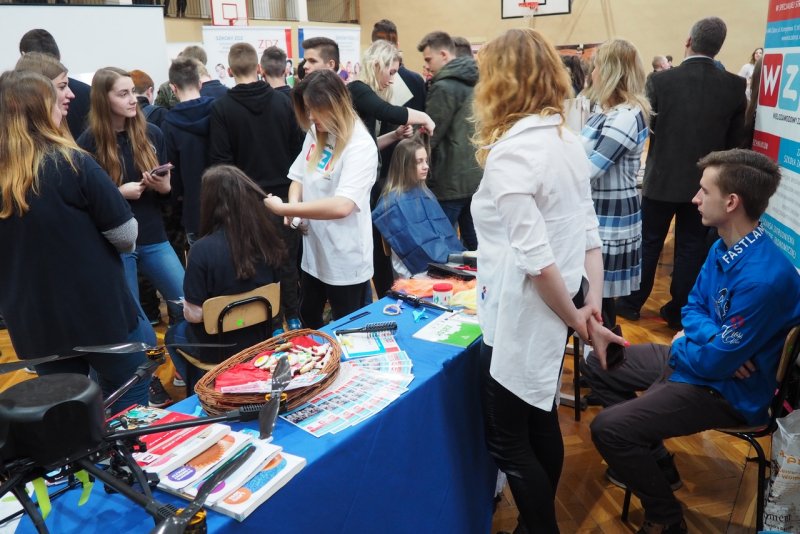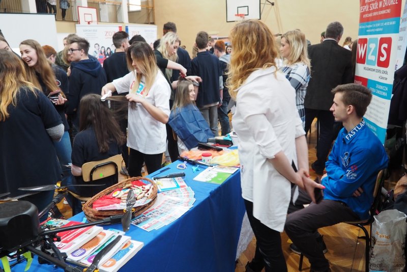 W kalendarzu imprez WZSu Targi Edukacyjne w Brzeźnicy stały się obowiązkową pozycją. 22 marca 2017r. w hali sportowej Zespołu Szkolno-Przedszkolnego swoją ofertę edukacyjną prezentowało 16 szkół ponadgimnazjalnych powiatu wadowickiego, oświęcimskiego i krakowskiego. Oficjalnego otwarcia Targów dokonali: dyrektor szkoły Anna Lang oraz wójt gminy Brzeźnica Bogusław Antos, który na Targi przybył wraz z przewodniczącą Rady Gminy Brzeźnica Jadwigą Kozioł oraz sekretarzem gminy Barbarą Klęczar. Nasi uczniowie z dużym zaangażowaniem prezentowali ofertę szkoły. Nikola i Iza czarowały grzebieniem i nożyczkami w zaimprowizowanym stanowisku fryzjerskim. Gimnazjaliści mogli zakosztować ciasteczek upieczonych przez naszych mistrzów kuchni. Zaawansowany technologicznie dron oraz możliwość prowadzenia statku bezzałogowego na symulatorze wzbudzało duże zainteresowanie. Równolegle w sali nad halą sportową Adrian i Bartosz wręczali nagrody dla najspostrzegawczych gimnazjalistów. Wszystkiego dopełniał samochód dumnie prezentujący barwy WZSu. Targi to kolejny element promocji naszej szkoły. Już 24-25 kwietnia otwieramy drzwi naszej szkoły. Pomożemy gimnazjalistą podjąć decyzję o wyborze dalszej ścieżki kariery.