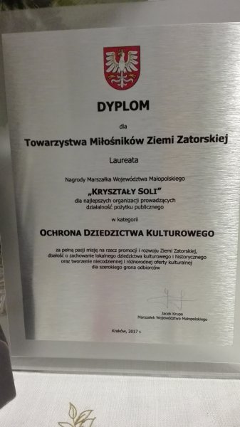 Nagrody Marszałka Województwa Małopolskiego „Kryształy Soli”. Towarzystwo Miłośników Ziemi Zatorskiej zostało Laureatem w kategorii : Ochrona Dziedzictwa Kulturowego.
