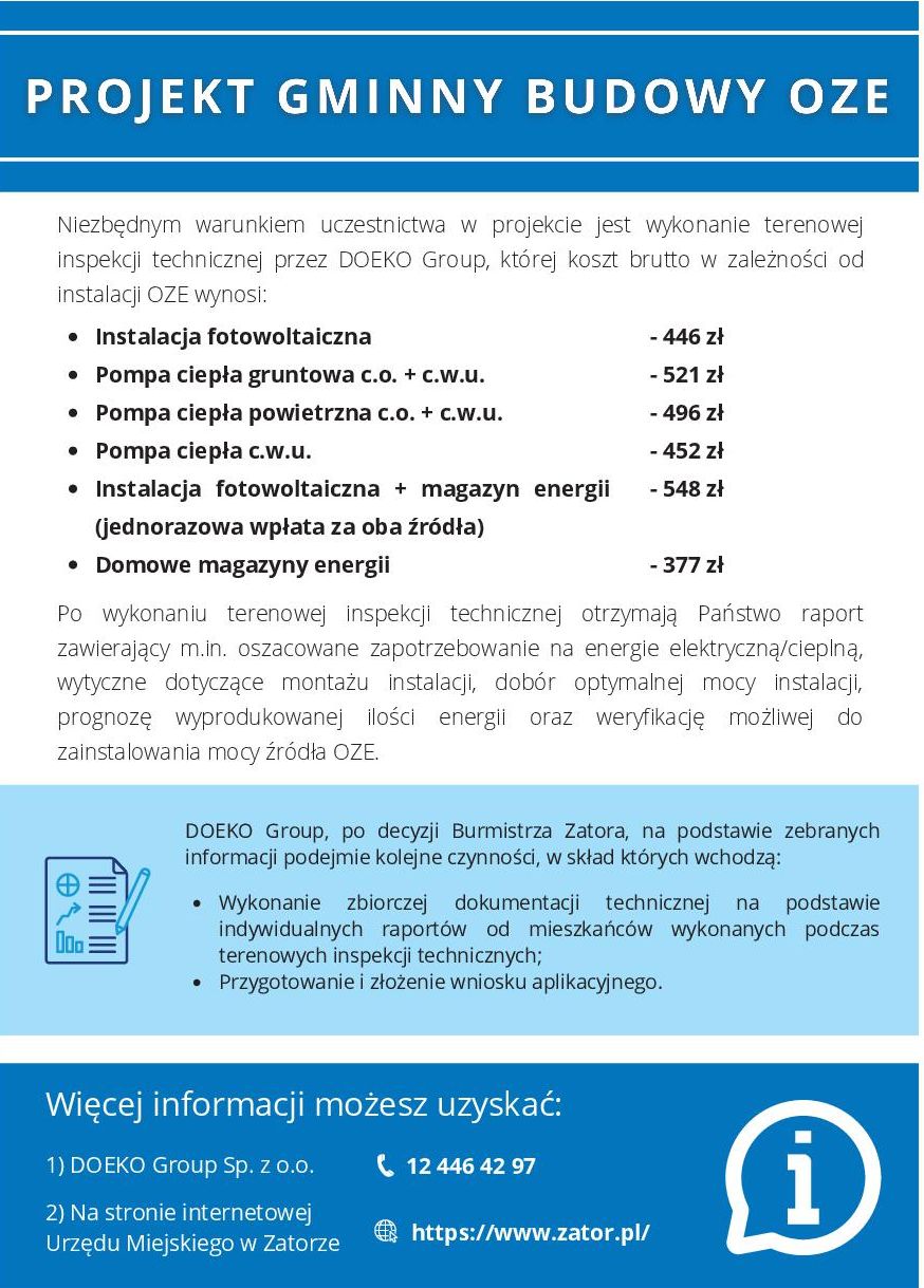 Gmina Zator, widząc zapotrzebowanie i zainteresowanie mieszkańców Odnawialnymi Źródłami Energii na swoim terenie, informuje o możliwości pozyskania dofinansowania dla instalacji: fotowoltaiki, pomp ciepła, magazynów energii. Przewidywany poziom dofinansowania to maksymalnie 85%.