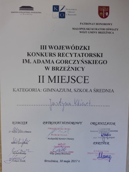 Konkurs pod patronatem Małopolskiego Kuratora Oświaty i Wójta Gminy Brzeźnica, odbył się 30 maja 2017r. Gminnej Bibliotece Publicznej w Brzeźnicy. Justyna zajęła w nim II miejsce. Gratulujemy !