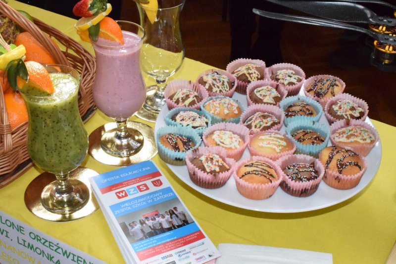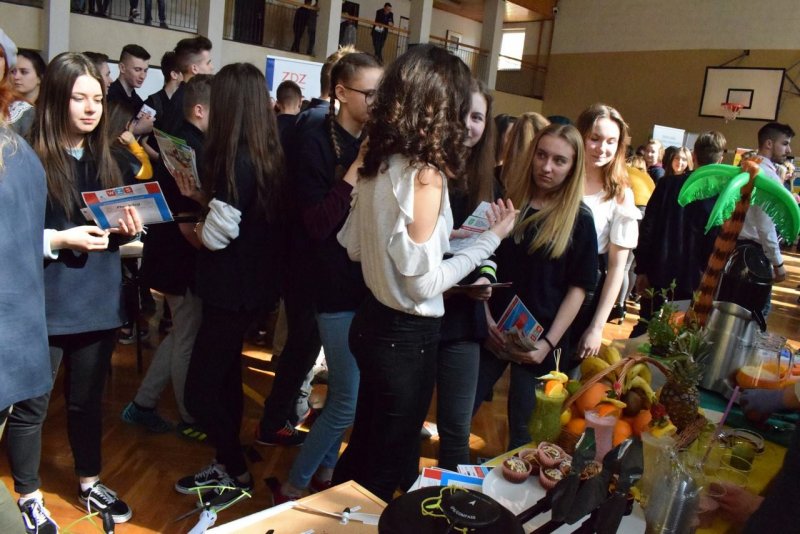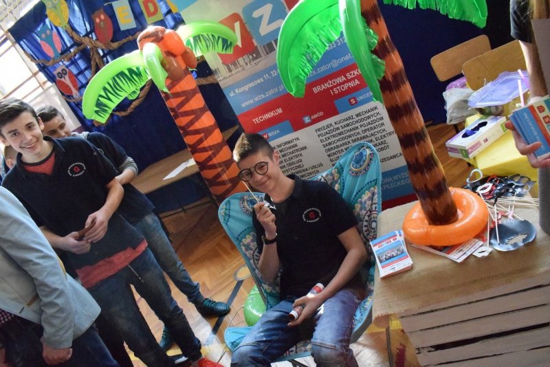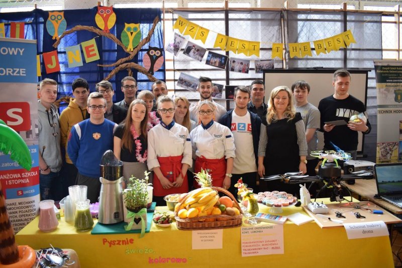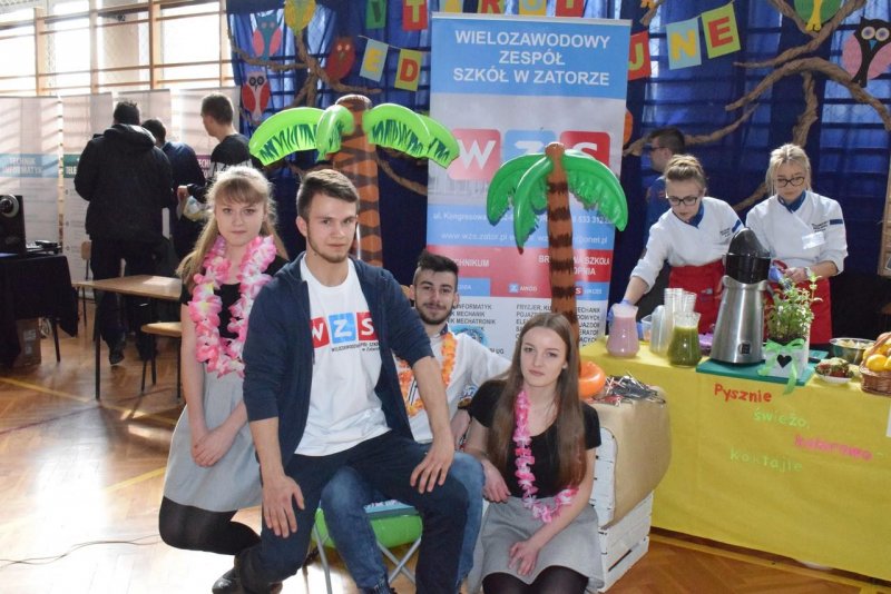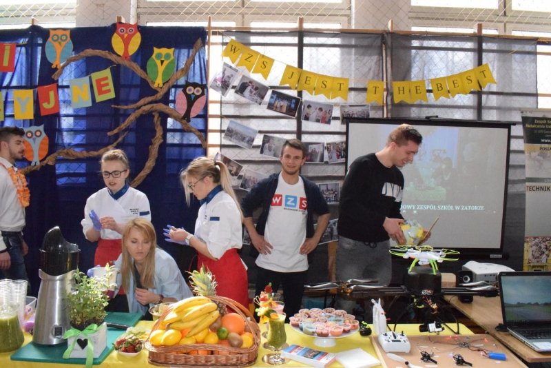 We środę (21.03.2018r.) nasza szkoła zaprezentowała się na prestiżowych Targach Edukacyjnych w Brzeźnicy pośród 19 innych placówek. Stawili się przedstawiciele niemalże wszystkich zawodów pokazując co WZS ma do zaoferowania. Od momentu wkroczenia gimnazjalistów na salę nasze stoisko było oblegane non stop. Nie ma się co dziwić, gastronomia przygotowywała na bieżąco kolorowe koktajle ze świeżo wyciskanych owoców i warzyw. Z drinkiem w ręku można było zasiąść pod palmami w asyście naszych turystów. A może pamiątkowa fotka do tego? Proszę bardzo! Można było odlecieć... nawet dronem! Jak to mawiał filmowy klasyk: "wszystkiego było w opór" ;)