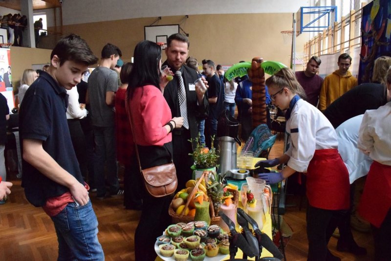 We środę (21.03.2018r.) nasza szkoła zaprezentowała się na prestiżowych Targach Edukacyjnych w Brzeźnicy pośród 19 innych placówek. Stawili się przedstawiciele niemalże wszystkich zawodów pokazując co WZS ma do zaoferowania. Od momentu wkroczenia gimnazjalistów na salę nasze stoisko było oblegane non stop. Nie ma się co dziwić, gastronomia przygotowywała na bieżąco kolorowe koktajle ze świeżo wyciskanych owoców i warzyw. Z drinkiem w ręku można było zasiąść pod palmami w asyście naszych turystów. A może pamiątkowa fotka do tego? Proszę bardzo! Można było odlecieć... nawet dronem! Jak to mawiał filmowy klasyk: "wszystkiego było w opór" ;)
