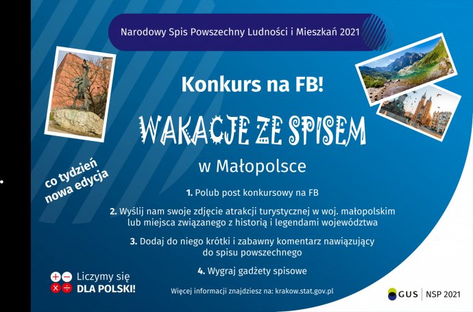 Urząd Statystyczny w Krakowie ogłasza konkurs dla użytkowników platformy Facebook obserwujących profil Urzędu Statystycznego w Krakowie pt. „Wakacje ze spisem”.