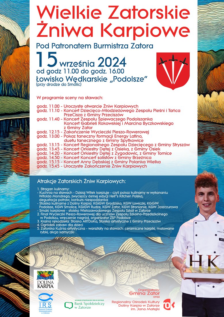 Przed nami ostatnia duża plenerowa impreza przed sezonem jesienno-zimowym! Zapraszamy na Wielkie Zatorskie Żniwa Karpiowe! W programie koncerty, pokazy, występy, wspólne gotowanie, warsztaty... Początek o 11:00 na Łowisku Podolsze w niedzielę, 15 września.