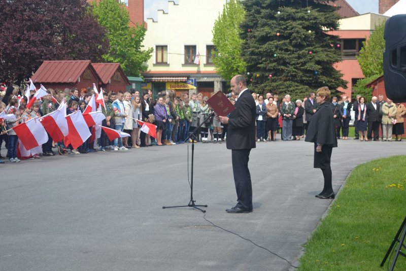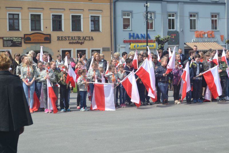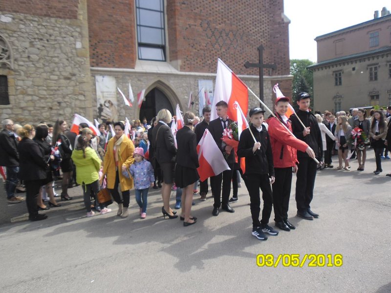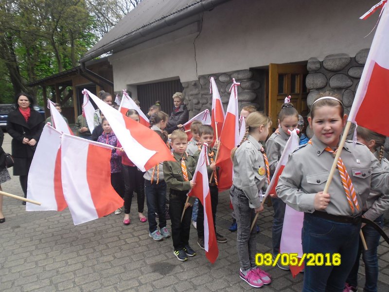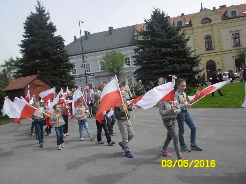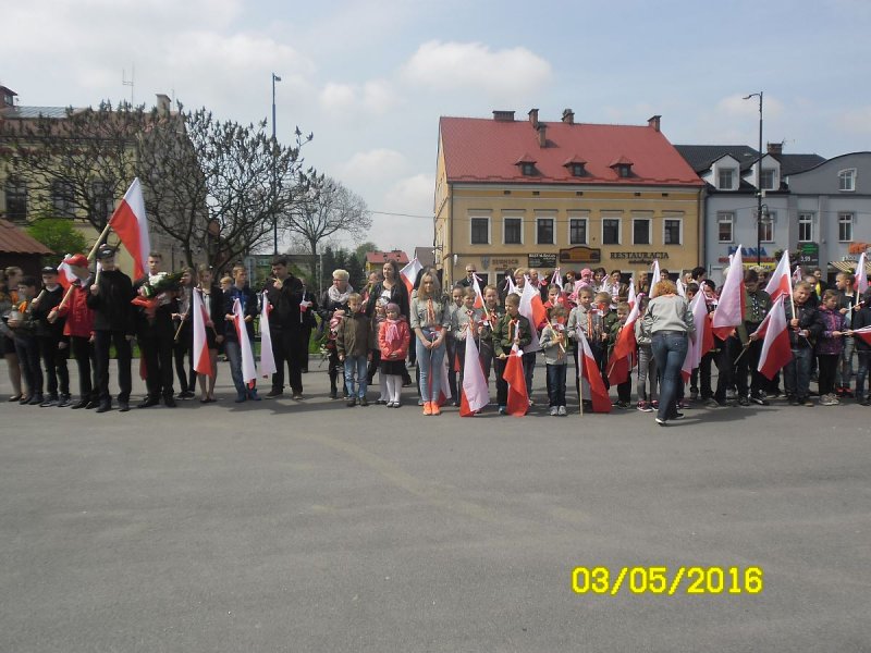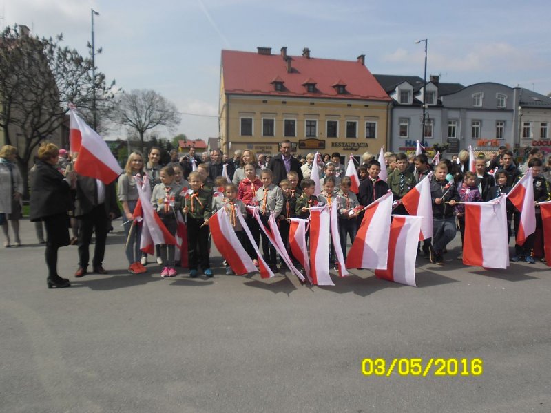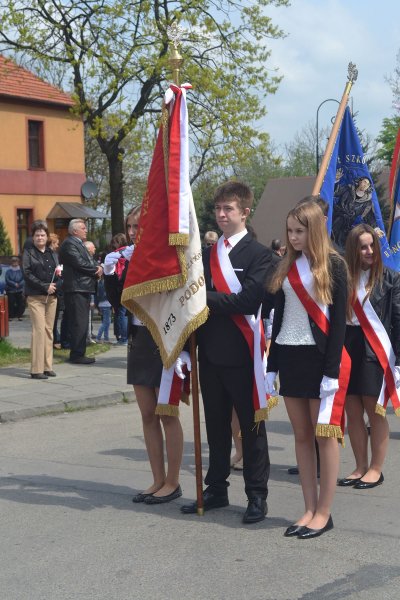 Wszyscy oni zgromadzili się w kościele parafialnym na mszy świętej w intencji Ojczyzny, którą sprawował ksiądz proboszcz. Nie zabrakło też pocztu sztandarowego szkoły. W tym roku licznie przybyli uczniowie z Podolsza- od najmłodszych dzieci- drużynę zuchów, przez uczniów szkoły podstawowej i gimnazjalistów oraz harcerzy- wyposażeni zostali w biało-czerwone flagi, które z dumą trzymali podczas mszy, a następnie nieśli w pochodzie na zatorski rynek. Najmłodszym dzieciom obecnym na uroczystości rozdali biało-czerwone wiatraczki, które wesoło kręciły się, napędzane majowym wiatrem.