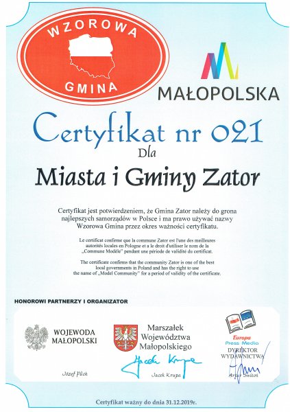Odbierając certyfikat „Wzorowej Gminy” Burmistrz Zatora podkreślił, że jest to to ogromne wyróżnienie dla całej gminy, a nagrodę dedykuje wszystkim mieszkańcom i przedsiębiorcom, jako wyraz dobrej, codziennej współpracy podczas realizacji projektów wspierających mieszkańców i rozwój gminy. `