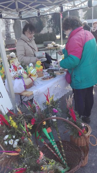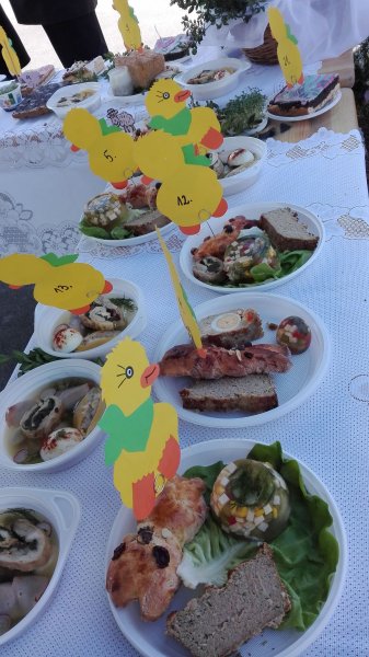 Barwne jak zwykle stoisko TMZZ kusiło barankami i ciastami ( miodownikiem, rafaello, szarlotką, makowcem, śmietanową chmurką, mazurkami, różyczkami z masą marcepanową oraz zajączkami z ciasta drożdżowego). Ponadto były zestawy dla smakoszy mięs , sałatek i pasztetów. Były też jajka faszerowane i pracochłonne, smaczne jajka z galarety i warzyw. Degustować do woli można było tradycyjne sałatki: jarzynową , z ryżem i tuńczykiem , śledziową oraz chleb ze smalczykiem i ogórkami kiszonymi. Śledzie w zalewie octowo –cukrowej zniknęły w oka mgnieniu. Na stoisku można też było nabyć palmy wielkanocne przygotowane przez członkinie TMZZ .