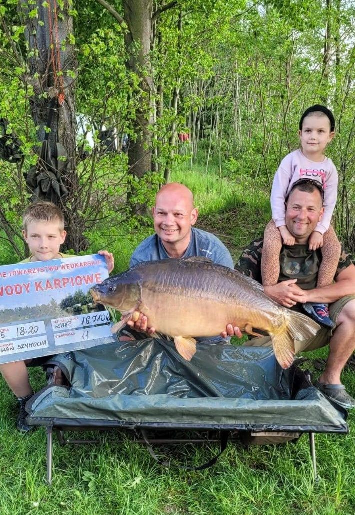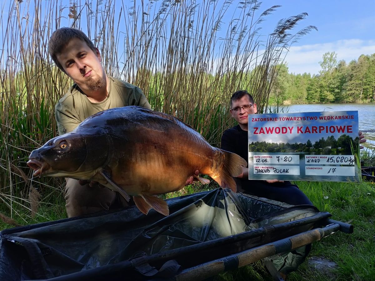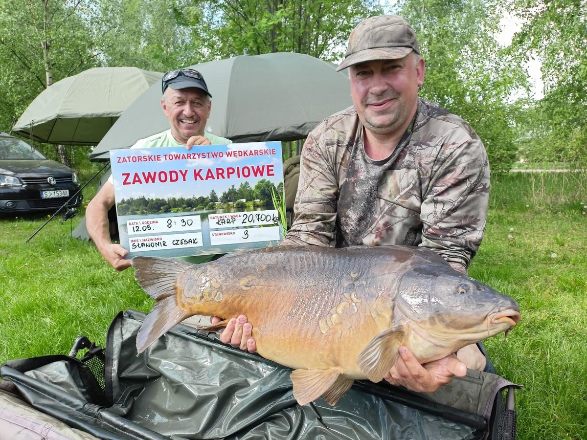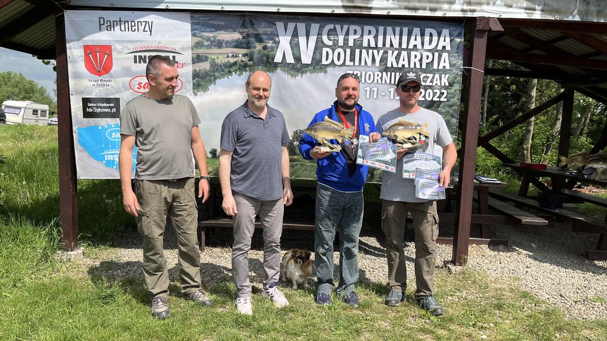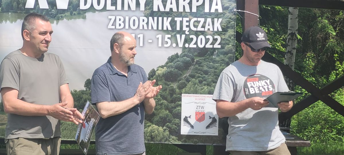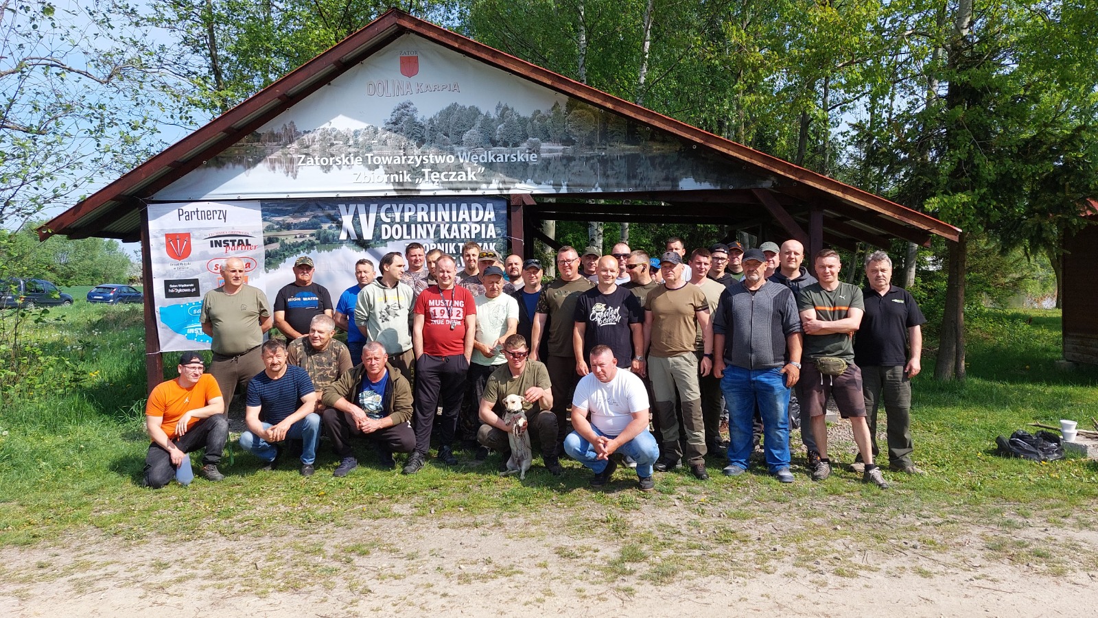 W dniach od 11 do 15 maja na zbiorniku Tęczak należącym do Zatorskiego Towarzystwa Wędkarskiego odbyła się XV Cypriniada Doliny Karpia. W zmaganiach uczestniczyło 18 dwuosobowych drużyn. Zawodnicy zjechali się na miejsce zbiórki w środę 11 maja o godz. 9:00. Po zgłoszeniu się do biura zawodów startujący otrzymali pakiety startowe oraz miał miejsce poczęstunek przepyszną grochówką przygotowaną przez naszego szefa kuchni kolegę Pawła Janasa. Nadmienić tutaj należy, że poza obiadami, które były dostarczane zawodnikom każdego dnia rywalizacji na stanowisku nr. 13 stworzyła się nieformalna stołówka w której każdy mógł liczyć na poczęstunek przygotowany przez Pawła. Ale wracając do zawodów, po poczęstunku nastąpiło oficjalne otwarcie zawodów oraz losowanie stanowisk. Podczas losowania były spore emocje ponieważ dobre miejsce może sprawić, że drużyna osiągnie dobry wynik. Po losowaniu zawodnicy rozjechali się na swoje stanowiska gdzie nastąpiło rozkładanie całego sprzętu wędkarskiego oraz swoich „domów” na kolejne kilka dni. O godz. 13:30 nastąpił początek łowienia. Do klasyfikacji końcowej liczyło się maksymalnie 5 największych karpi lub amurów danej drużyny. Już po 15 minutach kolega Sławek Proksa złowił pierwszą rybę. Po jakimś czasie następne ryby zaczęły być regularnie łowione na kolejnych stanowiskach. Jak pokazał czas ryby brały przede wszystkim na brzegu zlokalizowanym od strony Skawy a wpływ na to miał niewątpliwie wiejący w tamtym kierunku wiatr. Przez całe zawody dobre humory i pogoda dopisywały zawodnikom. W niedzielny poranek nastąpił koniec zawodów oraz ogłoszenie wyników. Puchary i nagrody wręczył Burmistrz Zatora Pan Mariusz Makuch oraz Prezes Zatorskiego Towarzystwa Wędkarskiego Robert Kajfasz. W tym miejscu należy podziękować także sponsorom czyli Gminie Zator, firmie Instal Partner, Sahara, Nemo oraz Haczykowo.pl dzięki którym pula nagród była wyższa. Największą rybę zawodów złowił kolega Sławomir Czeska a był nim karp o wadze 20,70 kg. Łowcą największego amura był Artur Ciślak. W sumie złowiono prawie 700 kg ryb. Bardzo ciekawie wyglądała rywalizacja o zwycięstwo. Różnica między 1 a 3 miejscem wynosiła zaledwie 8 kg. Pierwsza 10 zawodów wyglądała następująco: