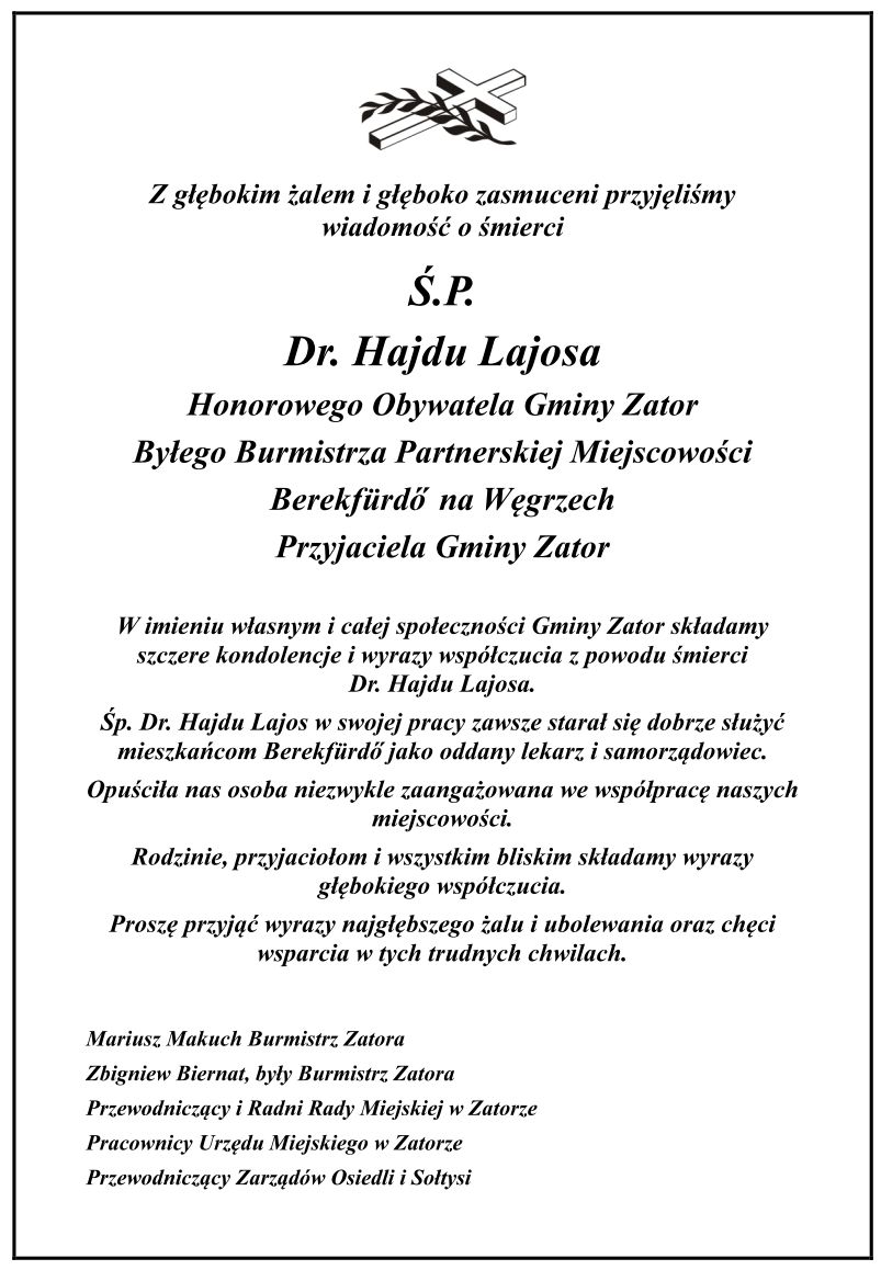 Z głębokim żalem i głęboko zasmuceni przyjęliśmy wiadomość o śmierci Ś.P. Dr. Hajdu Lajosa 2020-03-28