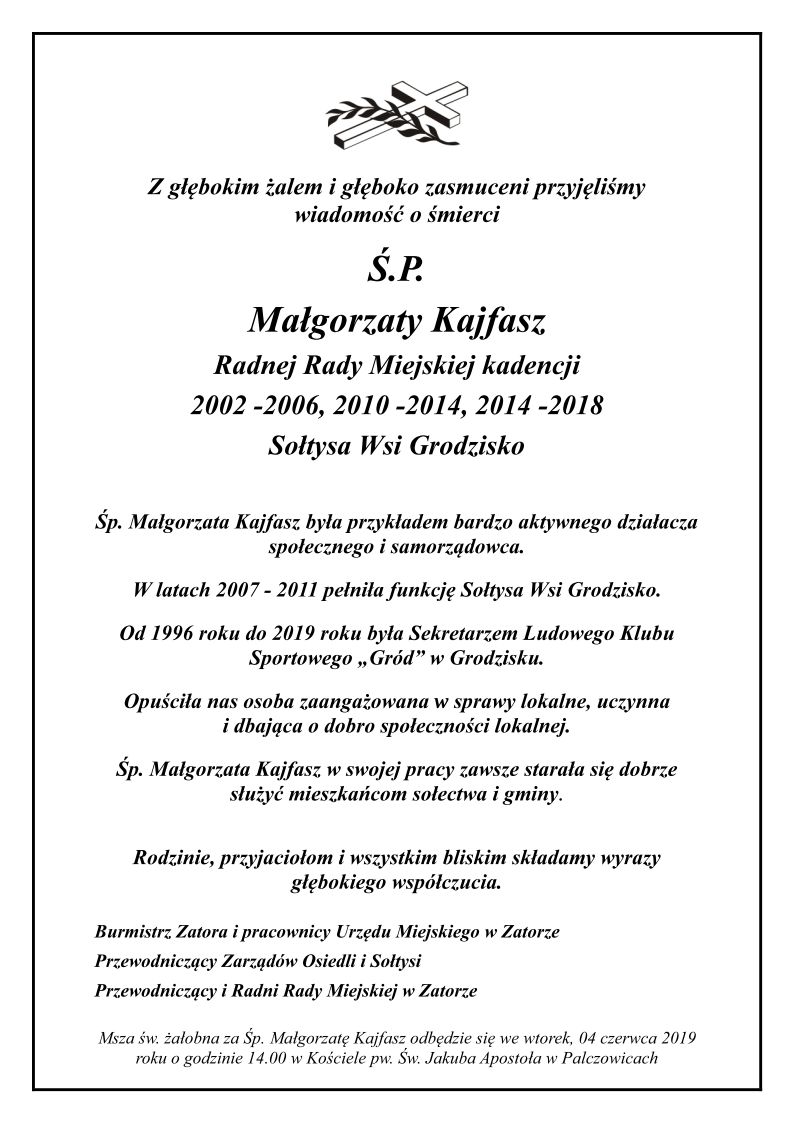 Z głębokim żalem i głęboko zasmuceni przyjęliśmy wiadomość o śmierci Ś.P. Małgorzaty Kajfasz 2019-06-03