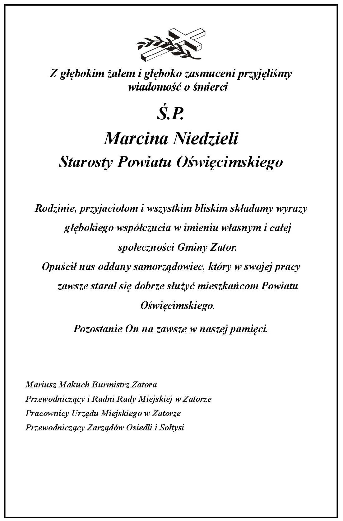 Z głębokim żalem i głęboko zasmuceni przyjęliśmy wiadomość o śmierci Ś.P. Marcina Niedzieli 2021-09-18