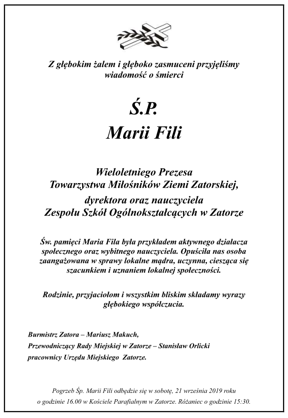 Z głębokim żalem i głęboko zasmuceni przyjęliśmy wiadomość o śmierci Ś.P. Marii Fili 2019-09-17