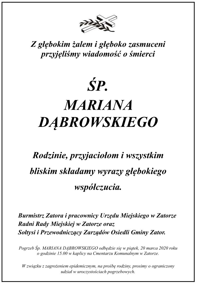 Z głębokim żalem i głęboko zasmuceni przyjęliśmy wiadomość o śmierci ŚP. MARIANA DĄBROWSKIEGO 2020-03-18