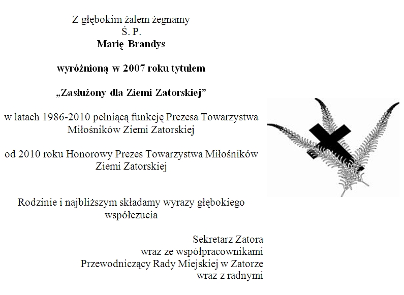 ŚP. Maria Brandys była wieloletnim nauczycielem geografii w Szkole Podstawowej w Zatorze. Jako opiekun Szkolnego Koła Krajoznawczego Turystycznego rozbudzała pasje turystyczne wśród młodzieży organizując wiele rajdów i wycieczek. W latach 1978-1981 pełniła funkcję prezesa ZO ZNP w Zatorze.