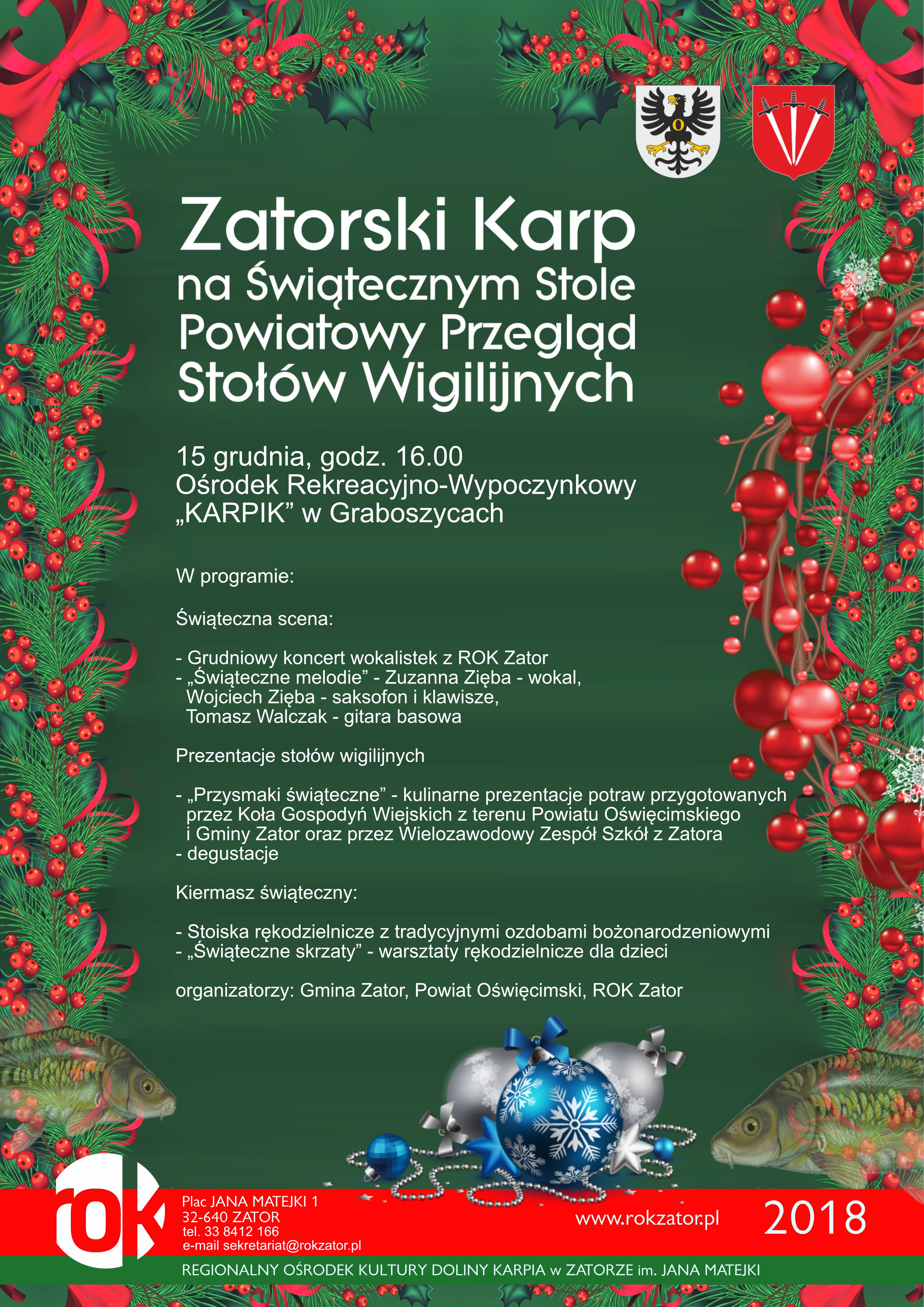 15 grudnia br. w Ośrodku Rekreacyjno Wypoczynkowym Karpik w Graboszycach odbyła się impreza pt. "Zatorski Karp na Świątecznym Stole Powiatowy Przegląd Stołów Wigiljnych". Wydarzenie promujące Karpia Zatorskiego oraz produkty i marki lokalne Doliny Karpia.