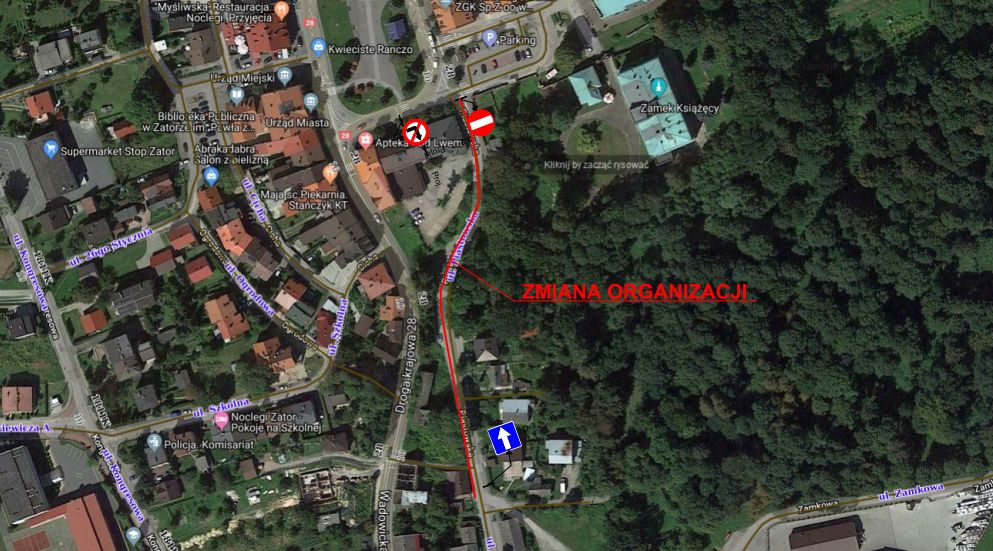 W związku z postępem prowadzonych prac przy rozbudowie budynku znajdującego się na rogu ul. Piastowskiej i Rynku, w najbliższy poniedziałek (tj. 04.03.2019r) inwestor planuje wprowadzić zatwierdzoną organizację ruchu drogowego. Przedmiotowa organizacja obejmuje wprowadzenie ruchu w jednym kierunku (w stronę Rynku). Aby dostać się z drogi krajowej nr 28 (Rynek) na ul. Piastowską, trzeba będzie kierować się w stronę Skawiny na drogę krajową nr 44, a następnie po przejechaniu ok 300 m skręcić w prawo w drogę gminną (ul. Zamkową), która po ok 700 m przechodzi w ul. Piastowską.