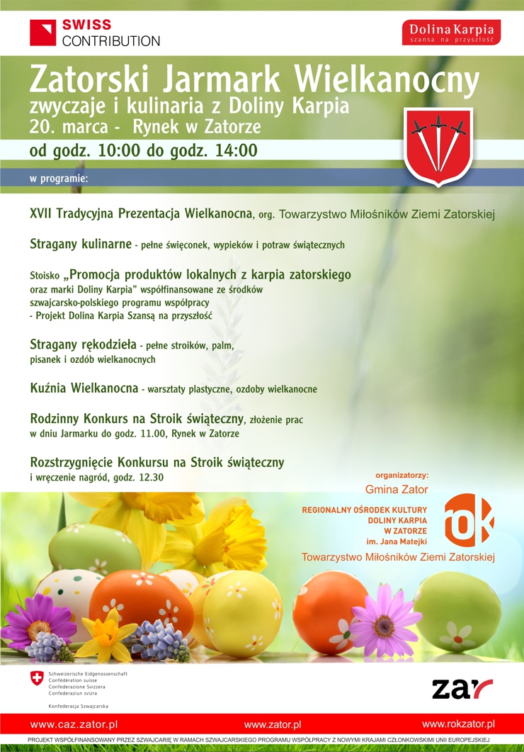 Tradycyjnie w niedzielę palmową na zatorskim Rynku odbył się Zatorski Jarmark Wielkanocny. Już po raz 17. Towarzystwo Miłośników Ziemi Zatorskiej zorganizowało prezentację kulinarną połączoną z degustacją produktów lokalnych Doliny Karpia. Panie z TMZZ oraz Koła Gospodyń Wiejskich z Łowiczek, Zatora i Stowarzyszenia „Trzewoje” przygotowały smakołyki świąteczne. Do kulinarnych straganów dołączyli także uczniowie Wielozawodowego Zespołu Szkół w Zatorze z pysznymi wypiekami i konkursem na najlepszą „Babę wielkanocną”.
