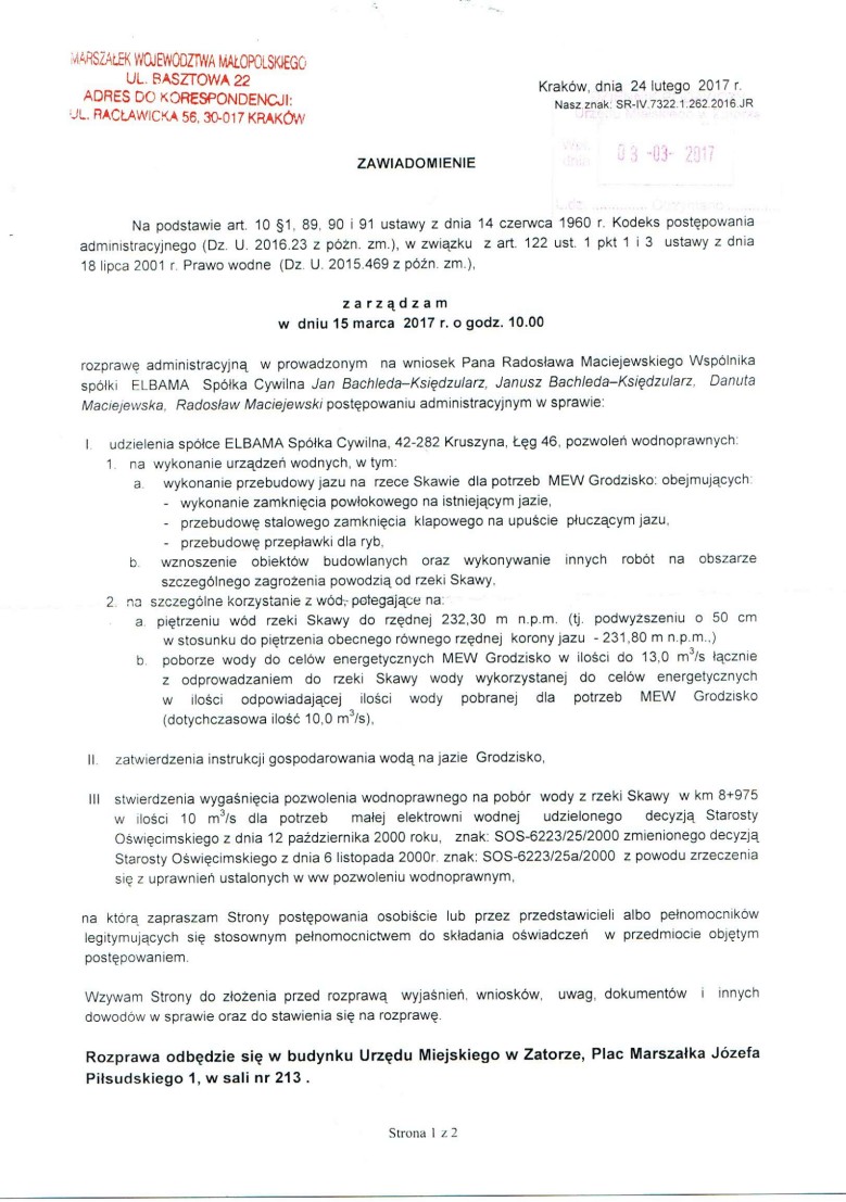 Zawiadomienie Marszałka Województwa Małopolskiego 2017-03-03