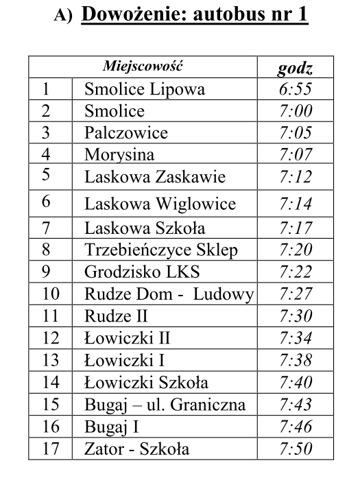 Z uwagi na zawieszenie zajęć stacjonarnych w klasach IV-VIII i przejście na tryb zdalny nauki po analizie obecnych kursów oraz zgłoszonych przez Dyrektorów Szkół list uczniów aktualnie korzystających z autobusu szkolnego od 2 listopada 2020 roku do odwołania zmianie ulega rozkład jazdy autobusu szkolnego następująco: