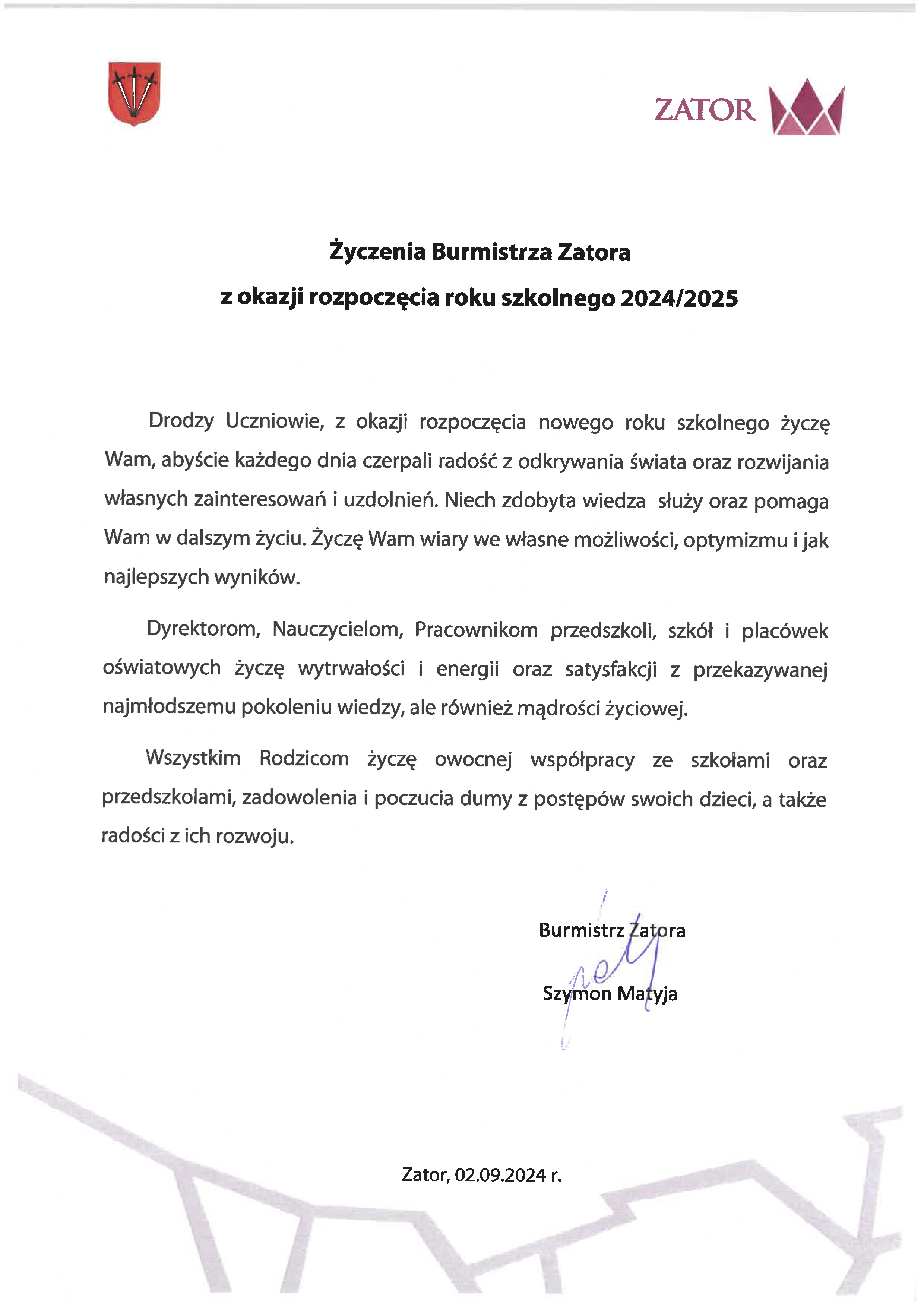 Życzenia Burmistrza Zatora z okazji rozpoczęcia roku szkolnego 2024/2025 2024-09-02