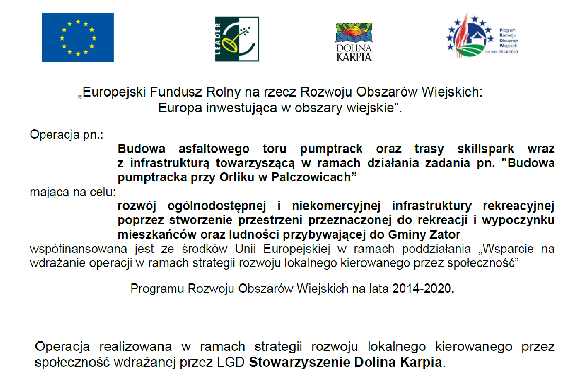 Inwestycję udało się zrealizować dzięki środkom z Programu Rozwoju Obszarów Wiejskich oraz konkursu „Rosnąca odporność”. Jej koszt to 756 tysięcy złotych. Wykonawcą inwestycji była firma BT Projekt, która specjalizuje się w budowie pumptracków.