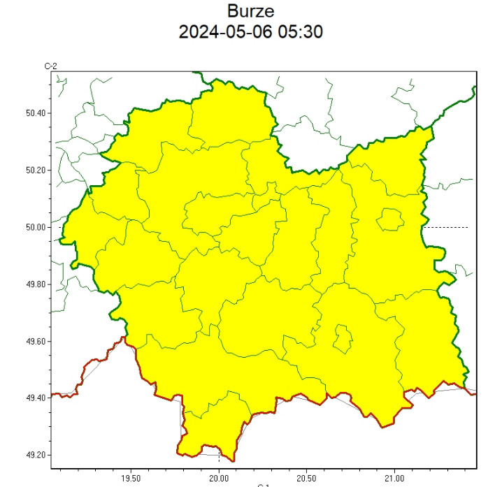 SMS IMGW-PIB OSTRZEGA: BURZE/1 małopolskie (wszystkie powiaty) od 15:00/06.05 do