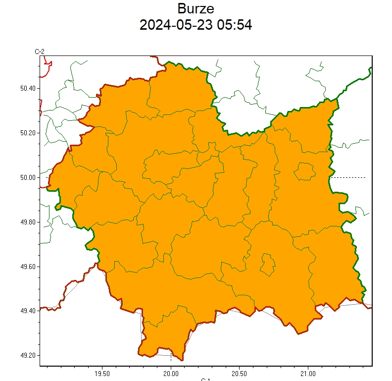 IMGW-PIB OSTRZEGA: BURZE/2 małopolskie (wszystkie powiaty) od 11:00/23.05 do 23:00/23.05.2024 deszcz 55 mm, porywy 70 km/h, grad. Dotyczy powiatów: wszystkie powiaty.