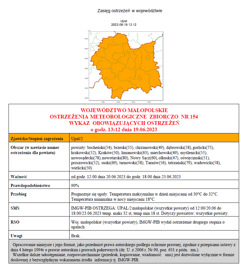 Województwo małopolskie wszystkie powiaty. Prognozuje się upały. Temperatura maksymalna w dzień miejscami od 30°C do 32°C. Temperatura minimalna w nocy miejscami 18°C.