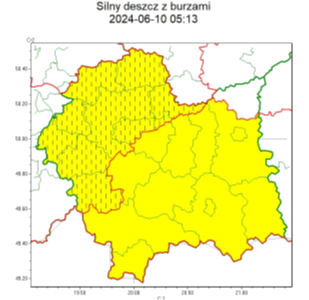 02:00/11.06.2024 deszcz 55 mm, porywy 90 km/h, grad. Dotyczy powiatów: wszystkie