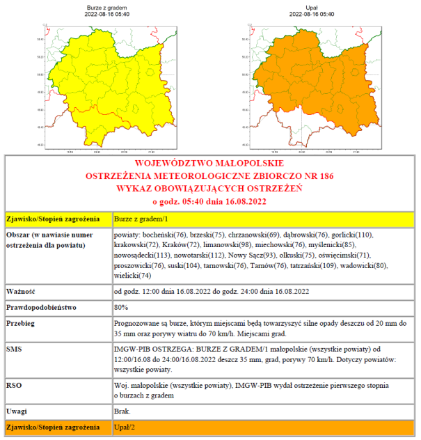 Ostrzeżenie meteorologiczne nr 186 burze z gradem 1 stopnia