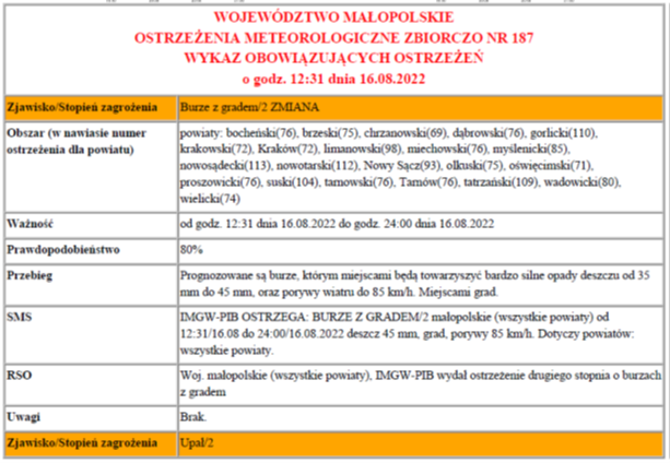 Ostrzeżenie meteorologiczne nr 187_ burze z gradem 2 stopnia Zmiana 2022-08-16