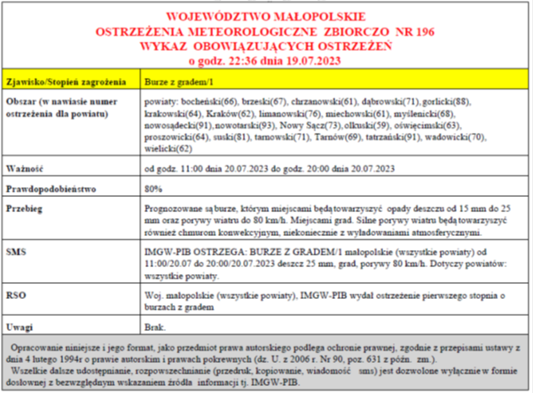 Ostrzeżenie meteorologiczne nr 196 -Burze z gradem 1 2023-07-20